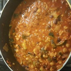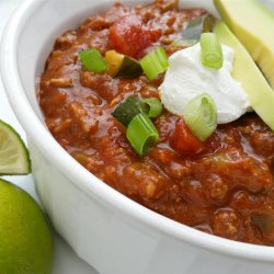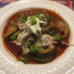 "Using some fresh and some canned ingredients, this chili is a snap to throw together and will keep you craving it for days. Chunky zucchini, fresh green onion, sour cream, and - what the heck - shredded Cheddar cheese, are sure to make this your favorite chili recipe. If you like beans in your chili, garbanzos right out of the can are great in this."
