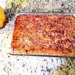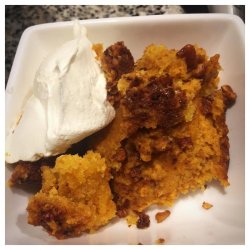 3Sprinkle cake mix over the top of the pumpkin mixture, and pat down. Sprinkle chopped pecans evenly over the cake mix, then drizzle with melted margarine.