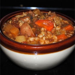 3Stir the bacon and cooked lamb meat back into the stew; mix in the fire-roasted tomatoes with their juice, and pour in enough beef stock to cover. Bring the mixture to a boil, reduce heat to a simmer, and cook for 1 hour and 45 minutes. Mix in the pearl barley, and simmer 15 minutes more. Stir in red potatoes, sliced carrots, rutabaga, and mushrooms, and simmer until the potatoes are tender, about 30 minutes.