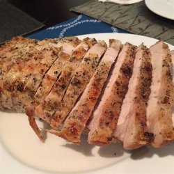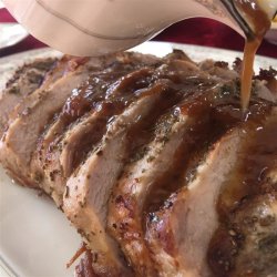 3Place pork loin into oven, turning and basting with pan liquids. Cook until the pork is no longer pink in the center, about 1 hour. An instant-read thermometer inserted into the center should read 145 degrees F (63 degrees C). Remove roast to a platter. Heat the wine in the pan and stir to loosen browned bits of food on the bottom. Serve with pan juices.
