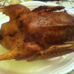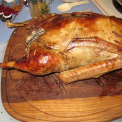 3Roast in a preheated 325 degree F (165 degree C) oven, breast side down, for 1 1/2 hours. Draw off the fat as it accumulates. Turn, and roast another 1 1/2 hours. When done, the juices should run clear when the bird is pricked where the thigh attaches to the body. Remove trussing strings and skewers before carving.