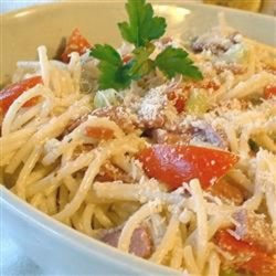 2In a large bowl combine cooked and drained spaghetti, grated Parmesan cheese, salami, Italian dressing, tomatoes, and green bell peppers. Toss gently to mix together.