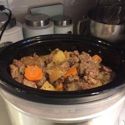 2Heat olive oil in a large skillet over medium-high heat. Add stew meat, and cook until evenly browned on the outside. Transfer to a slow cooker along with the carrots, potatoes, parsley, and pepper. In a small bowl, stir together 2 cups of boiling water and dry soup mix; pour into the slow cooker.
