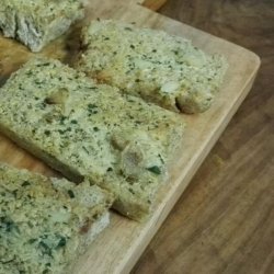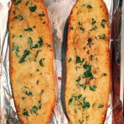3Squeeze the cloves of garlic from their skins into a medium bowl. Stir in the butter, parsley, and Parmesan cheese until well blended. Spread onto the cut sides of the bread.