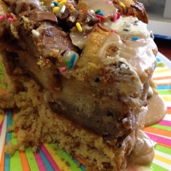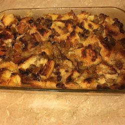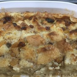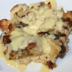 3Arrange bread cubes in a medium baking dish, and top with golden raisins. Cover with the whipped mixture. Allow the bread to become saturated with the mixture.