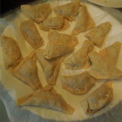 3Place approximately 1 tablespoon of the cabbage and pork mixture in the center of each wrapper. Fold wrappers in half over filling, and seal edges with moistened fingers.