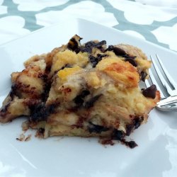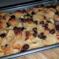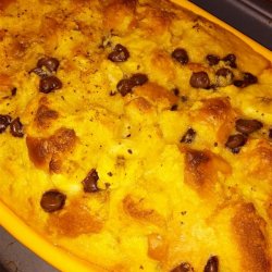2In a large mixing bowl, mix eggs, milk, sugar, and vanilla until smooth. Stir in bread, bananas, and chocolate chips, and let rest 5 minutes for bread to soak. Pour into prepared pan.