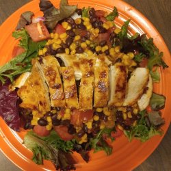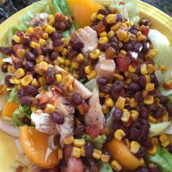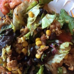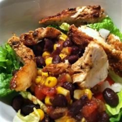 3Prepare the salad by tossing the greens, onion and tomato. Top salad with chicken and dress with the bean and corn mixture.
