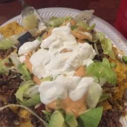 2Crush the bag of chips, open the bag, and toss the broken chips into a large bowl with the lettuce, cheese and tomatoes. When the meat mixture is done, combine it with the lettuce, tomatoes, chips and mix well. Then, add salsa and sour cream.