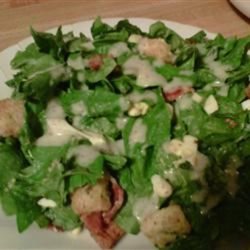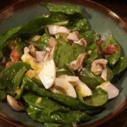 4In a large salad bowl, combine the eggs, bacon, spinach, croutons and mushrooms. Toss to mix. Pour enough dressing over salad to lightly coat. Toss and serve.