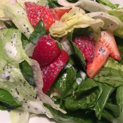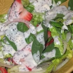 1In a large salad bowl, combine the romaine, spinach, strawberries and sliced onion.