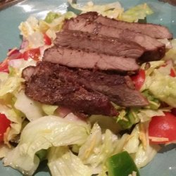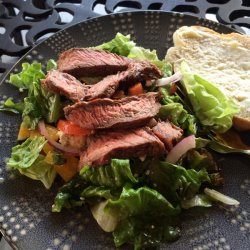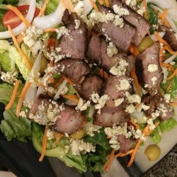 4Onto chilled plates arrange the lettuce, tomato, pepper, onion and olives. Top with steak and drizzle with dressing. Serve with crusty grilled French bread. Enjoy!