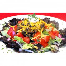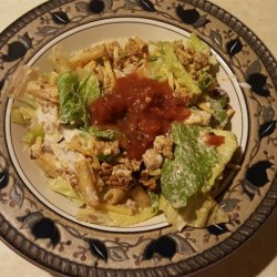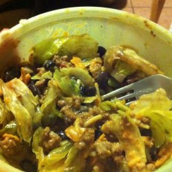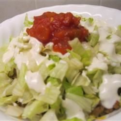 2Place chips into a large bowl, and crush into bite-size pieces. Combine with seasoned meat, cheese, beans, tomatoes, lettuce, and green onions. Pour dressing over all, and toss to coat.