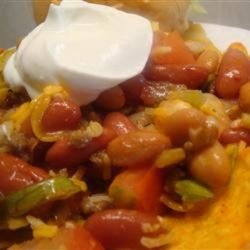 In a large bowl, combine the beef mixture, lettuce, red onion, green onion, pinto beans, kidney beans, tomatoes, avocado and cheese. Mix well.