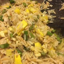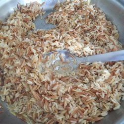 1Melt the butter in a lidded skillet over medium-low heat. Cook and stir orzo pasta until golden brown. Stir in onion and cook until onion becomes translucent, then add garlic and cook for 1 minute. Mix in the rice and chicken broth. Increase heat to high and bring to a boil. Reduce heat to medium-low, cover, and simmer until the rice is tender, and the liquid has been absorbed, 20 to 25 minutes. Remove from heat and let stand for 5 minutes, then fluff with a fork.