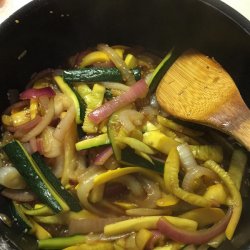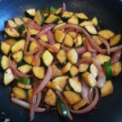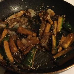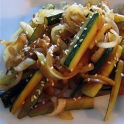 1Warm the oil in a large skillet over medium heat. Stir in onions, and cook 5 minutes. Add zucchini, and cook, stirring, about 1 minute. Stir in teriyaki sauce, soy sauce, and sesame seeds. Cook until zucchini are tender, about 5 minutes. Stir in ground pepper, and serve immediately.