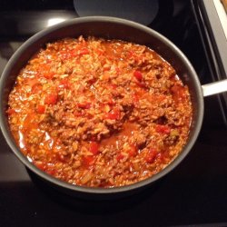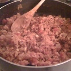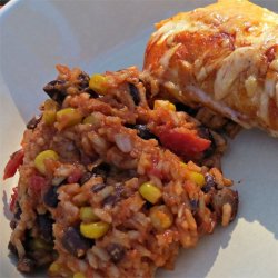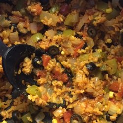 3Cook and stir onion in reserved bacon grease over medium heat until tender, about 5 minutes. Stir in rice; cook and stir until lightly browned, 3 to 5 minutes. Pour boiling chicken broth and tomato sauce into rice mixture; add diced tomatoes, green peppers, and chopped bacon. Season with chili powder, salt, and pepper. Cover and simmer until rice is tender and liquid is absorbed, 30 to 40 minutes. Stir black olives and corn into rice mixture before serving.