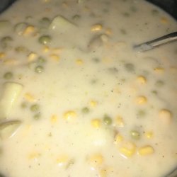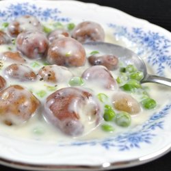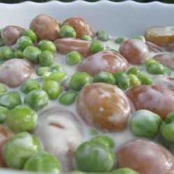 3Using the same saucepan, melt butter over medium heat. Stir in flour to make a thick paste; gradually whisk in milk, stirring constantly until slightly thickened. Season with salt and pepper to taste. Now add potatoes and peas to the sauce; simmer for about 5 minutes, stirring often. Serve immediately.