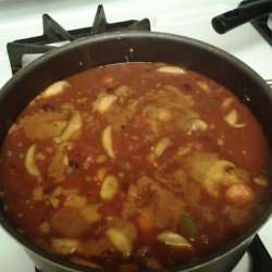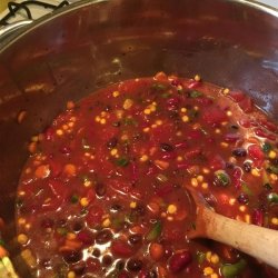 2Stir in tomatoes with their liquid, black beans and their liquid, tomato paste, red wine, hot pepper sauce, and water.
