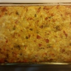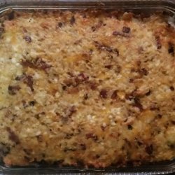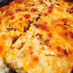 "This hearty casserole has bacon, eggs, hash browns, and three different cheeses all baked into a comforting breakfast dish, perfect for feeding a crowd."