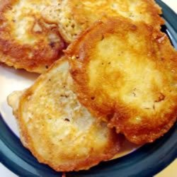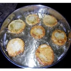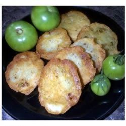 2Heat the oil in a skillet over medium heat. Dip tomato slices in the batter to coat, then fry in the skillet 5 minutes on each side, until golden brown. Eat while hot.