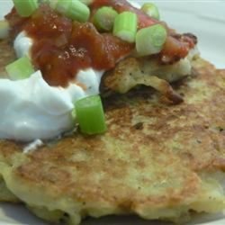 2Heat the olive oil in a large skillet over medium-high heat. Drop in the potato mixture, forming patties about 2 inches in diameter. Fry on both sides until golden brown, 3 to 4 minutes per side. Drain on a paper towel-lined plate. Serve warm.