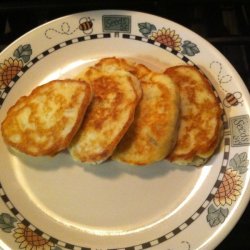2In a large skillet, heat oil over medium high heat. Drop large spoonfuls of the potato batter into the skillet and flatten cakes slightly with a spatula. Cook for about 4 minutes on each side, until golden brown. Serve immediately.