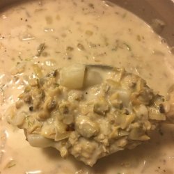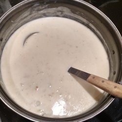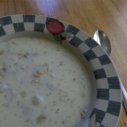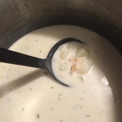 4Slowly pour hot clam stock into butter/flour mixture while stirring constantly. Continue stirring and slowly bring to a boil. Reduce heat and add cooked potatoes. Mix in half and half, salt and pepper and chopped dill. Heat through but do not boil.