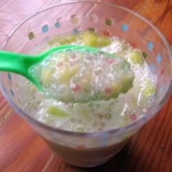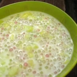 2Place mango and ice in a blender and blend until smooth. Divide chilled tapioca pearls in 2 tall glasses, then layer the mango mixture over and top each glass with a 1/4 cup of coconut milk.