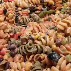 2Whisk the salsa, mayonnaise, sour cream, black beans, Mexican-style corn, red bell pepper, green onions, black olives, garlic powder, cumin, cilantro, salt, and pepper together in a large bowl; add the cooled pasta and stir to coat evenly. Cover the bowl with plastic wrap and refrigerate 2 hours to overnight before serving.