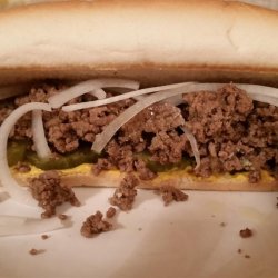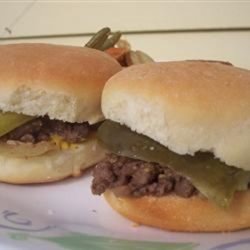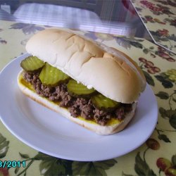 3Spread the desired amount of yellow mustard on the top half of each bun. Place 2 pickle slices on the bottom half, then spoon 2 to 3 tablespoons of the ground beef mixture over, and top with the other half of the bun to make a sandwich. Repeat until all the sandwiches are complete.