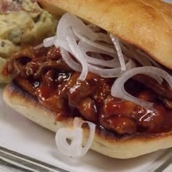 "This is a great (easy) recipe that you can use with left over steak. Serve on a hamburger bun. With only a few ingredients you'll have a great sandwich. My family is very picky about what they eat, but when we have this everyone cleans their plate. Shred the cooked steak in a blender."