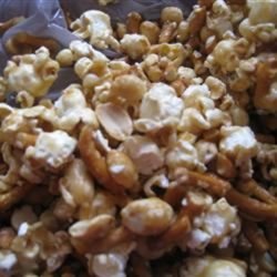 "This is a very good holiday treat the my kids can't get enough of. It combines the sweetness of caramel with the saltiness of pretzels, nuts and popcorn. There is no mess because it is mixed in a large throw-away brown bag!"
