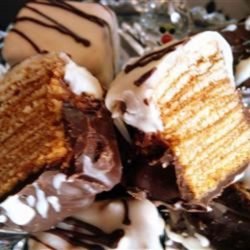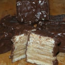 "A true Swiss Baumkuchen is almost impossible to make at home. It requires a rotating spit, and almost a gallon of batter, and loads of time. This is a smaller version, although it too takes time. The results taste a little like a Kit-Kat bar. The many layers will remind you of the famous Dobostorte."