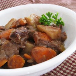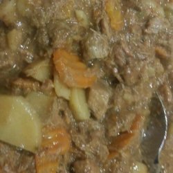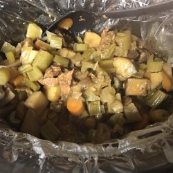 1Place meat in slow cooker. In a small bowl mix together the flour, salt, and pepper; pour over meat, and stir to coat meat with flour mixture. Stir in the garlic, bay leaf, paprika, Worcestershire sauce, onion, beef broth, potatoes, carrots, and celery.