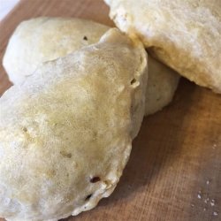 2Roll the dough with a rolling pin until thin, sprinkling with flour to prevent from sticking. Brush with melted butter and roll it like a jelly roll. Cut with a sharp knife into 1 1/2-inch slices. Roll each piece into a circle and fill with about 1 tablespoon filling. Fold over into half moons and seal.