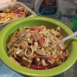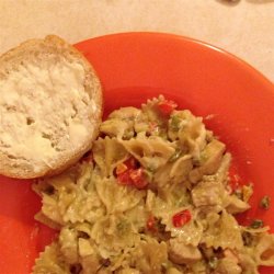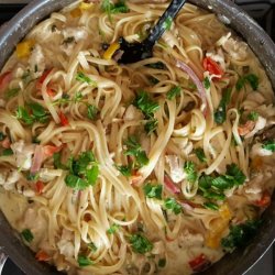 4When the peppers have wilted, add the chicken and soy sauce. Toss and add the reserved tequila/lime paste and cream. Bring to a boil. Gently simmer until chicken is cooked through and sauce is thick. Toss with well drained fettuccini and garnish with cilantro. Serve.