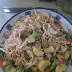 3Heat remaining 2 tablespoons olive oil in the same skillet over medium-high heat. Saute zucchini, yellow squash, onion, red bell pepper, and garlic in hot oil until slightly tender but still crisp, 5 to 10 minutes. Stir chicken into vegetable mixture.
