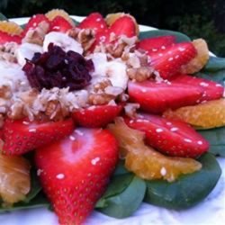 "Fresh spinach leaves topped with strawberries, bananas, mandarin oranges, Craisins®, toasted sesame seeds, walnuts, and a honey dressing. Also good with some chicken strips mixed in."