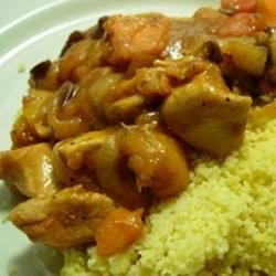 2Place the browned chicken and eggplant on the bottom of a slow cooker. Layer the onion, carrots, dried cranberries, and apricots over the chicken.