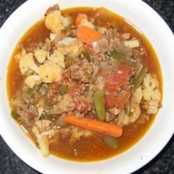 1Crumble the ground beef into a large stockpot set over medium heat. Cook and stir until meat is no longer pink. Drain off excess grease and add the olive oil. Heat the oil and add the garlic and onion; cook and stir until the onion is tender. Add cauliflower, jalapenos, shallot and mushrooms. Season with salt and cook for 8 to 10 minutes to release the water from the vegetables.