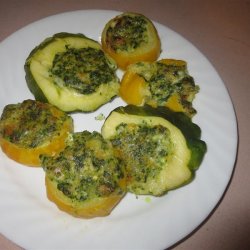 4Stir 1/2 of the mozzarella cheese and egg into spinach mixture; spoon into the hollowed squash. Arrange stuffed squash in a single layer on a baking sheet; top with remaining cheese. Pour enough hot water into pan to fill about 1/2-inch.