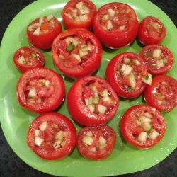 "Like deviled eggs, deviled tomatoes are carved and the insides mixed with other ingredients, which are put back inside. Except, the inside of the tomatoes are mixed with vinegar and olive oil rather than mayonnaise!"