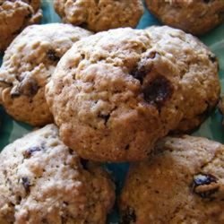 2In a large bowl, cream together the margarine, oil, brown sugar and white sugar until smooth. Beat in the egg substitute, vanilla and water. Combine the flour, baking soda, cinnamon and nutmeg; stir into the sugar mixture. Stir in the oats, oat bran, wheat germ, raisins and walnuts. Drop by teaspoonfuls onto the prepared cookie sheets.