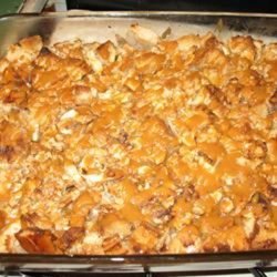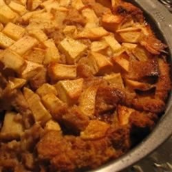 2Lightly grease a 13x9 inch baking pan. Cover the bottom with half of the bread cubes and then sprinkle on half of the apples. Repeat with the remaining bread and apples.