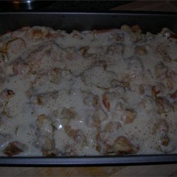 3In a large mixing bowl combine the eggs, cream, sugar, milk and cinnamon; beat well. Pour this mixture evenly over the bread cubes and apples.