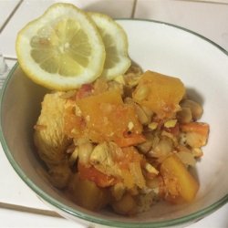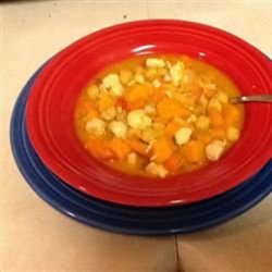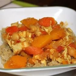 2Mix the squash, garbanzo beans, carrot, tomatoes with juice, broth, sugar, and lemon juice into the skillet. Season with salt, coriander, and cayenne pepper. Bring the mixture to a boil, and continue cooking 30 minutes, until vegetables are tender.