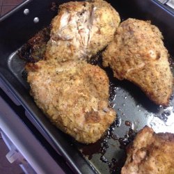 2Dredge chicken breasts in salad dressing, then coat completely with bread crumbs. Place coated chicken breasts in a lightly greased 9x13 inch baking dish and bake in the preheated oven for about 30 minutes, or until chicken is cooked through and juices run clear.