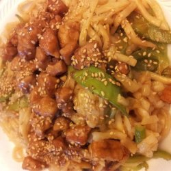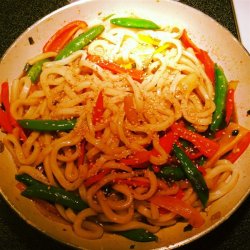 3In a microwave-safe bowl, combine the green, red, and yellow peppers with green onion and peas. Heat in the microwave until warm, but still crisp. Add to the noodles in the bowl, and pour the dressing over all. Toss to coat everything in dressing, then sprinkle toasted sesame seeds over the top.