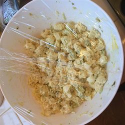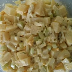 3In a large bowl, combine the potatoes, eggs, celery, onion, relish, garlic salt, celery salt, mustard, pepper and mayonnaise. Mix together well and refrigerate until chilled.